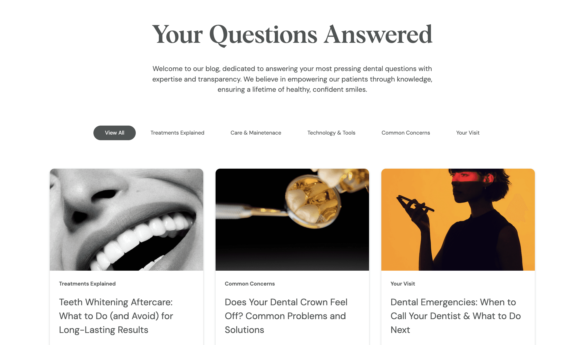 For example, rather than using traditional terms like 'Cosmetic Dentistry' or 'Smile Design' that emphasize aesthetics alone, we chose 'Smile Restoration' to reflect our comprehensive approach. This intentional language shift communicates that we're not just focused on surface-level appearances, but rather on restoring both the function and beauty of your smile for lasting oral health.